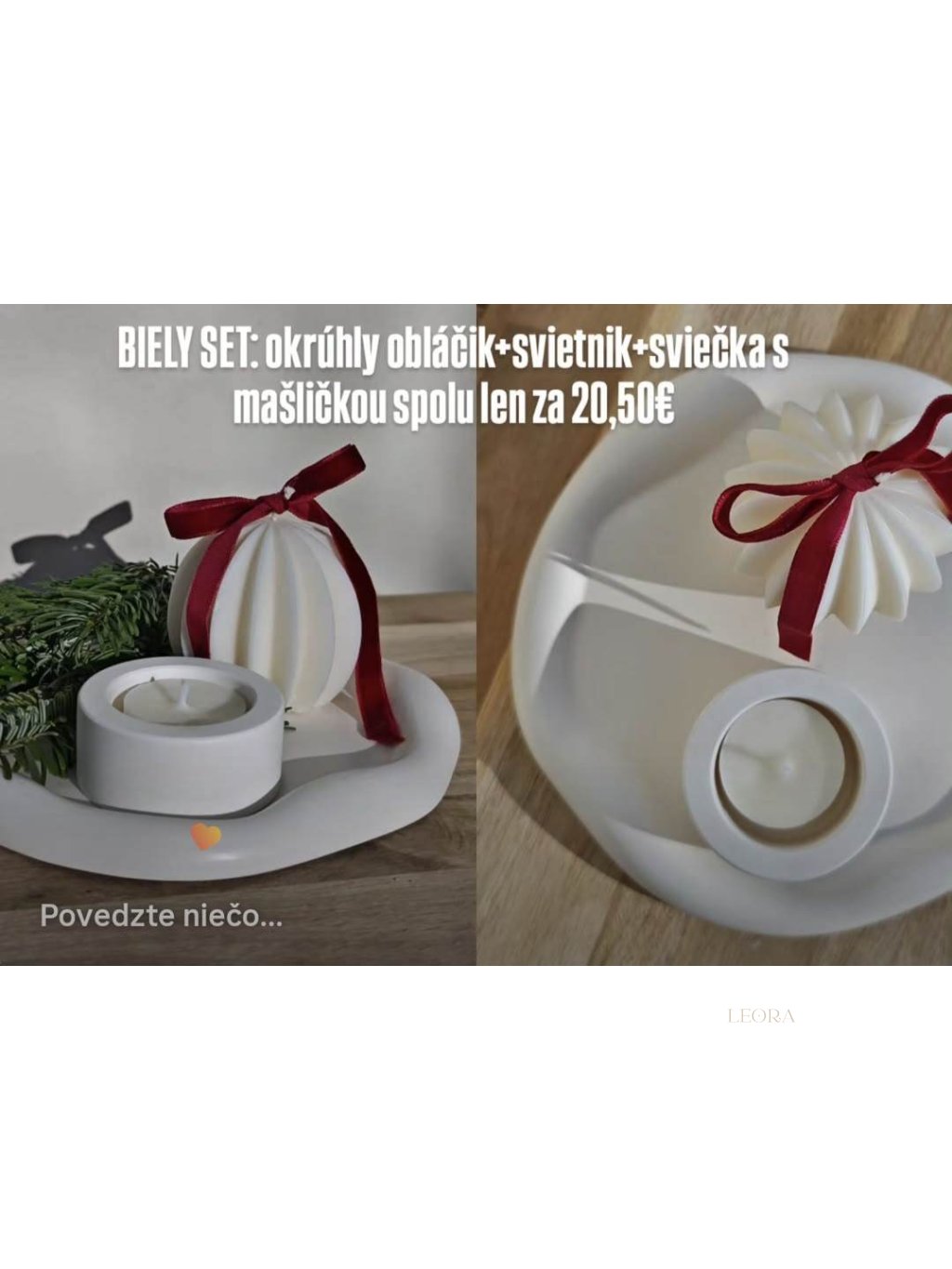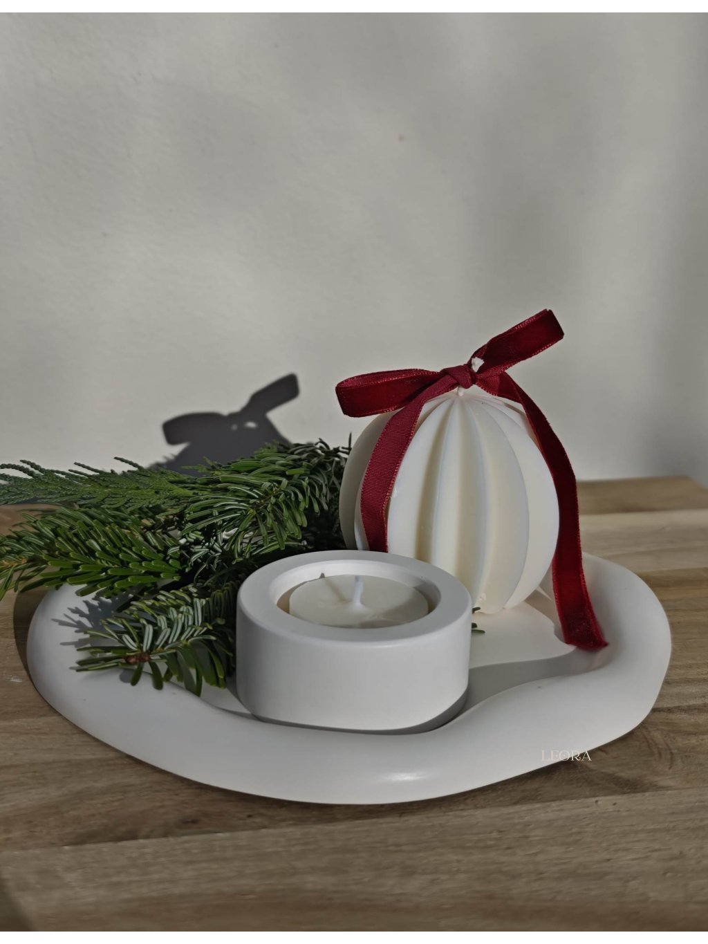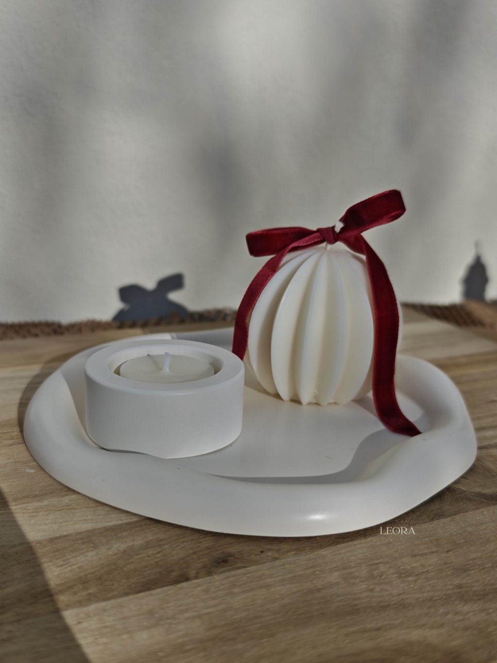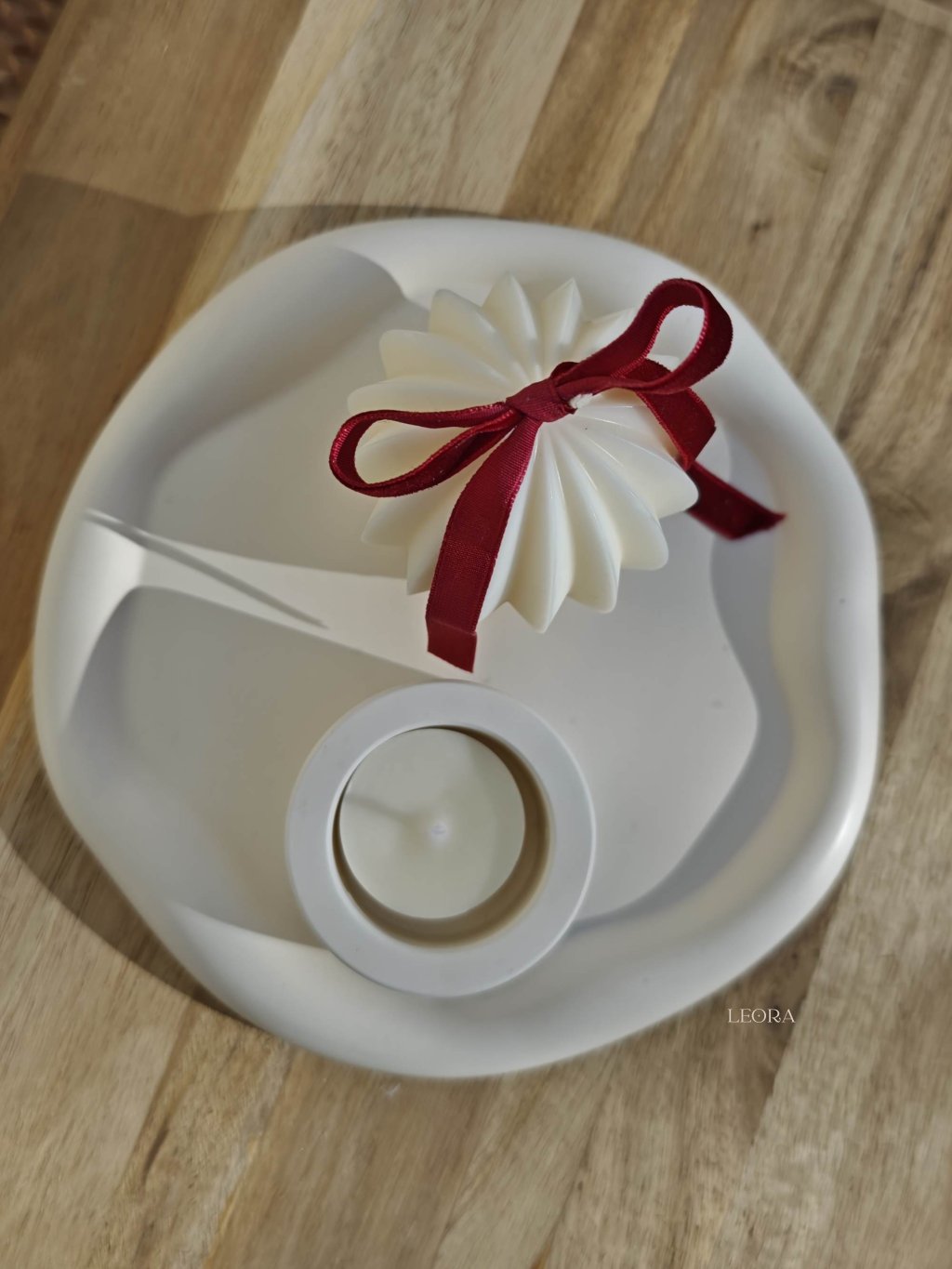 Ručne odlievaná sójová sviečka zaujmú svojou jedinečnou štruktúrou. Súčasťou setu je aj okrúhla tácka v tvare obláčika a okrúhly svietnik, spolu vytvárajú harmonický celok – ideálny na sviatočný stôl, poličku či ako darček pre milovníkov ručne vyrábaných dekorácií.