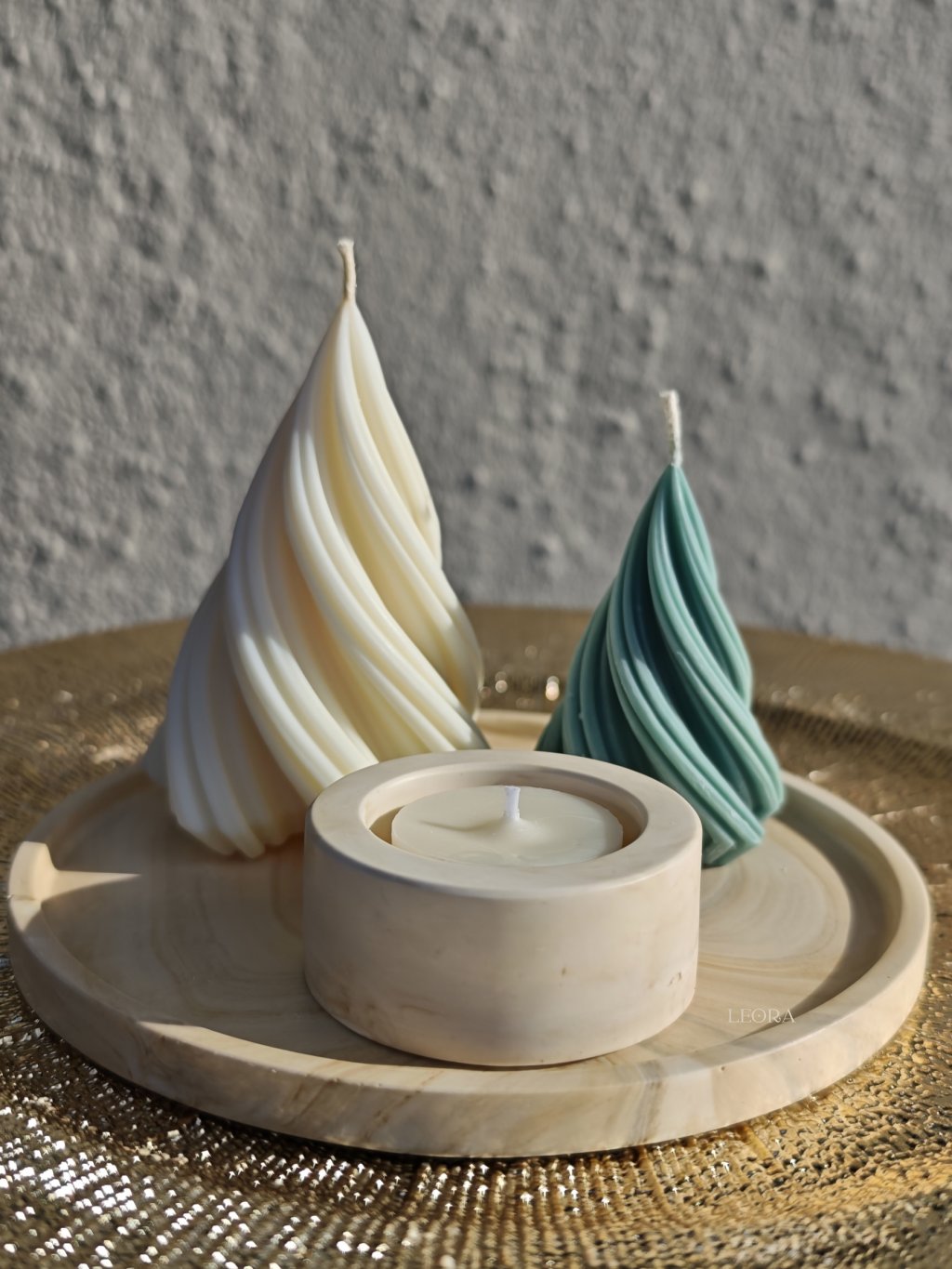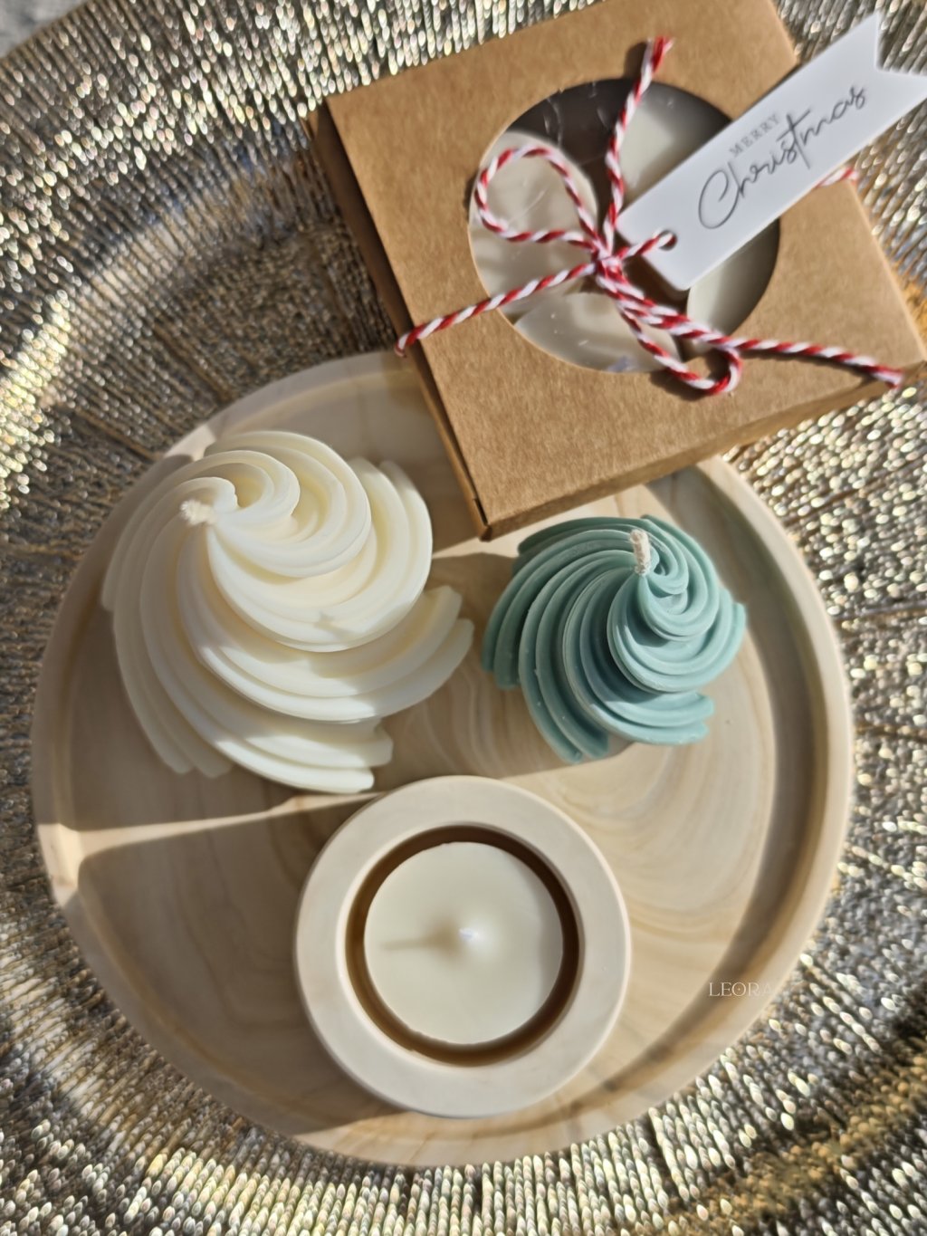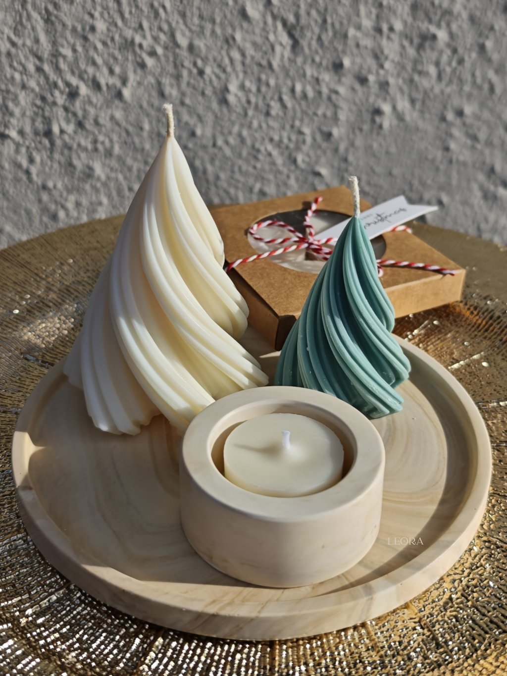Súčasťou setu je aj jesmonite svietnik a voňavá mini krabička so štyrmi čajovými sviečkami bezobalovými s vianočnou vôňou, spolu vytvárajú harmonický celok – ideálny na sviatočný stôl, poličku či ako darček pre milovníkov ručne vyrábaných dekorácií.