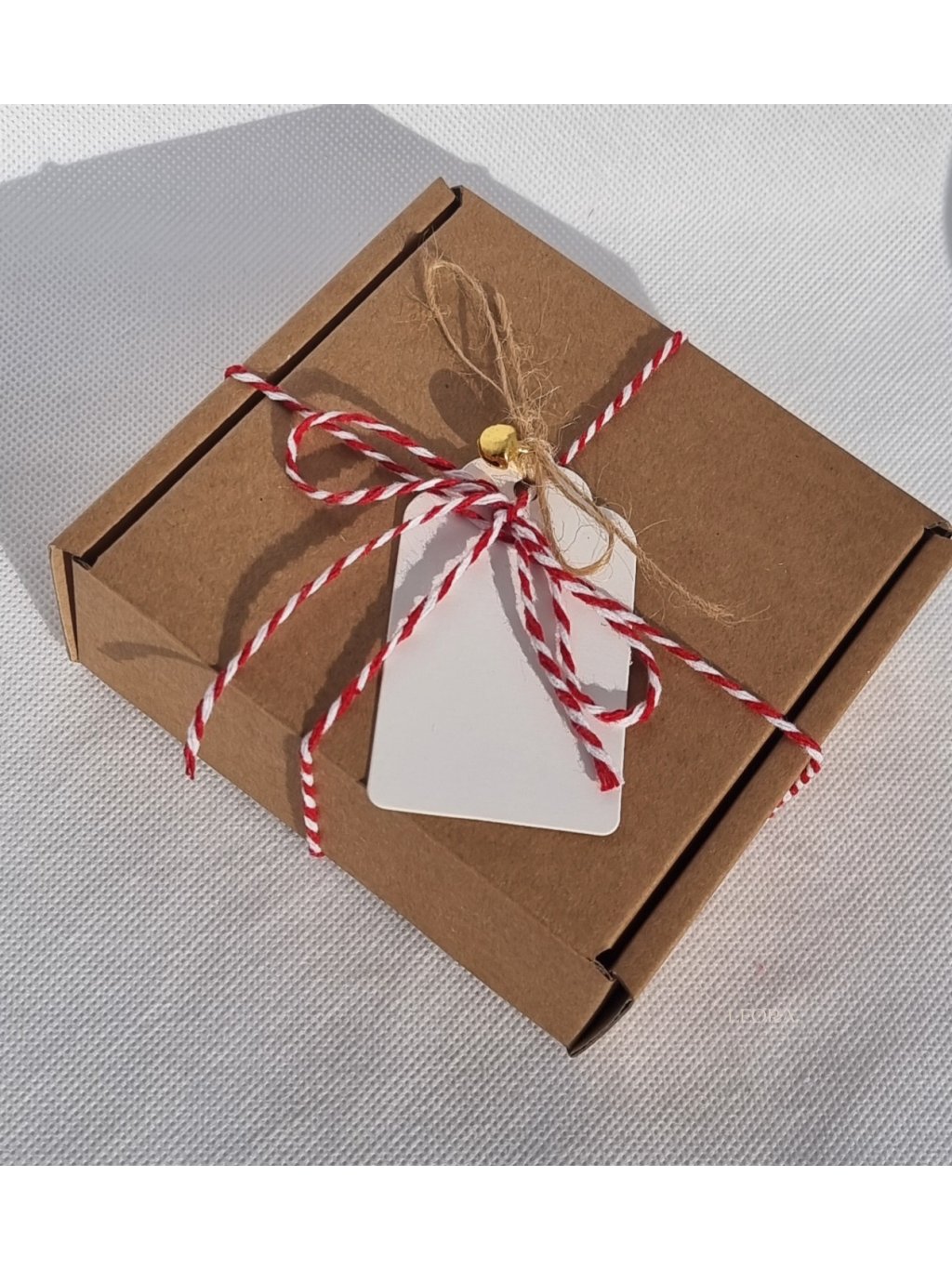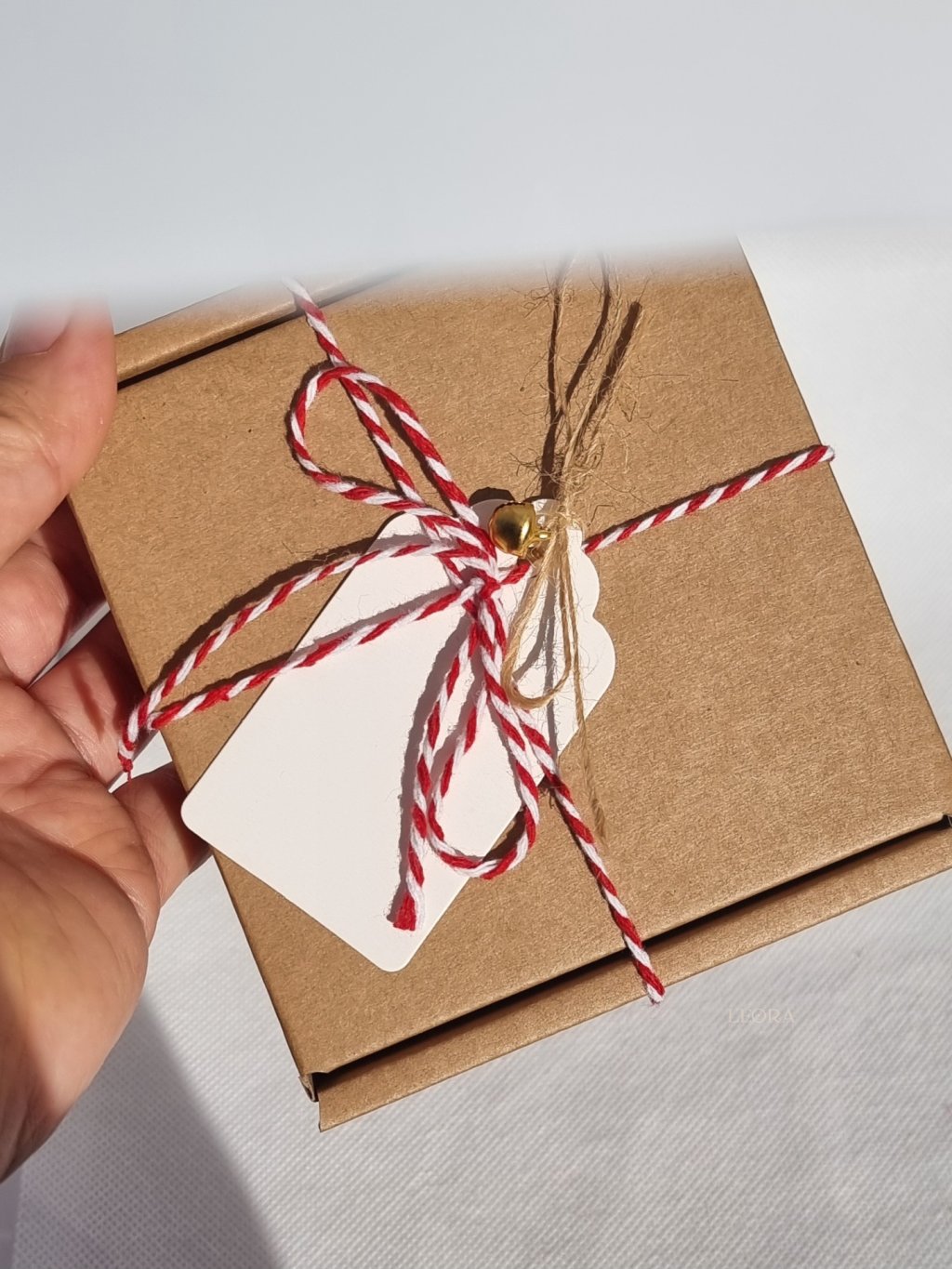 Vianočná Darčeková krabička je vyplnená recyklovateľným výplňovým materiálom z papiera a previazaná mašličkou s papierovou visačkou v tvare stromčeka s rolničkou na venovanie. Hotový darček rovno pod stromček.
