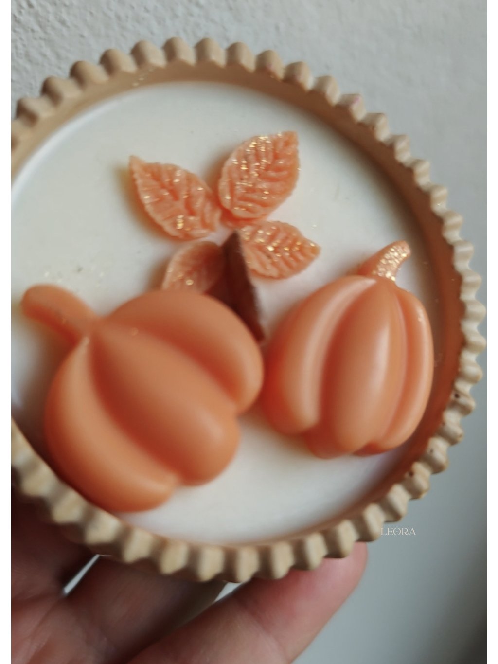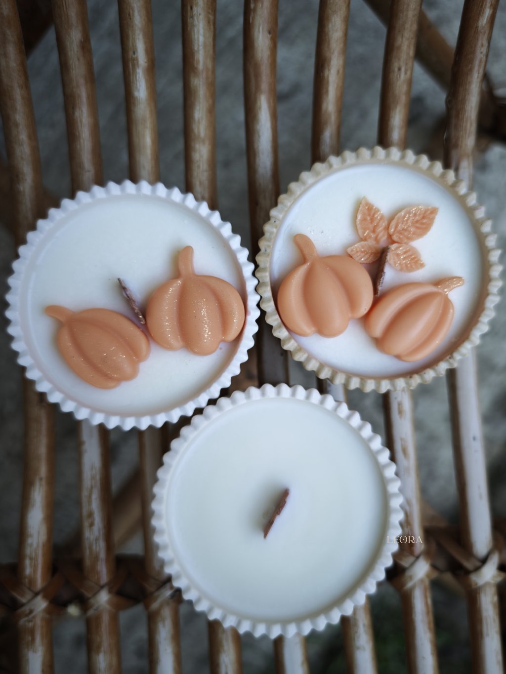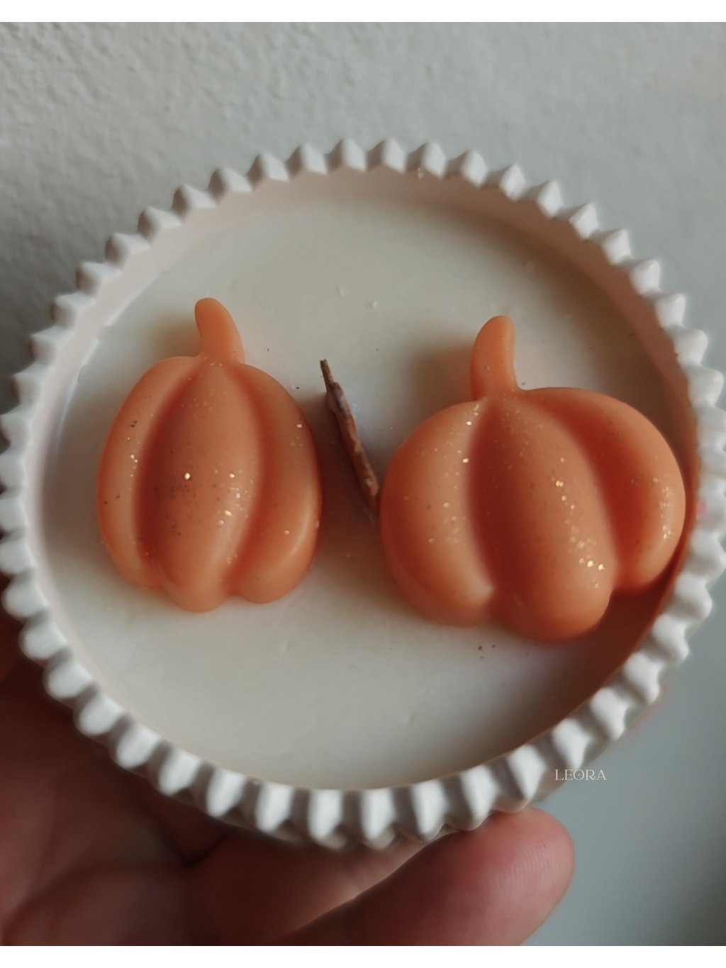 Oranžové voskové tekvičky sú zatiaľ len položené ako ozdoby na sviečke - ak máte radšej minimalizmus bez zdobenia stačí mi to napísať v poznámke a pošlem sviečku bez zdobenia :) ak vám vyhovuje zdobenie tak ako je - ozdôbky budú napevno k sviečke zlepené voskom.