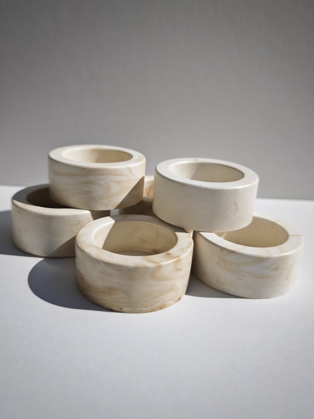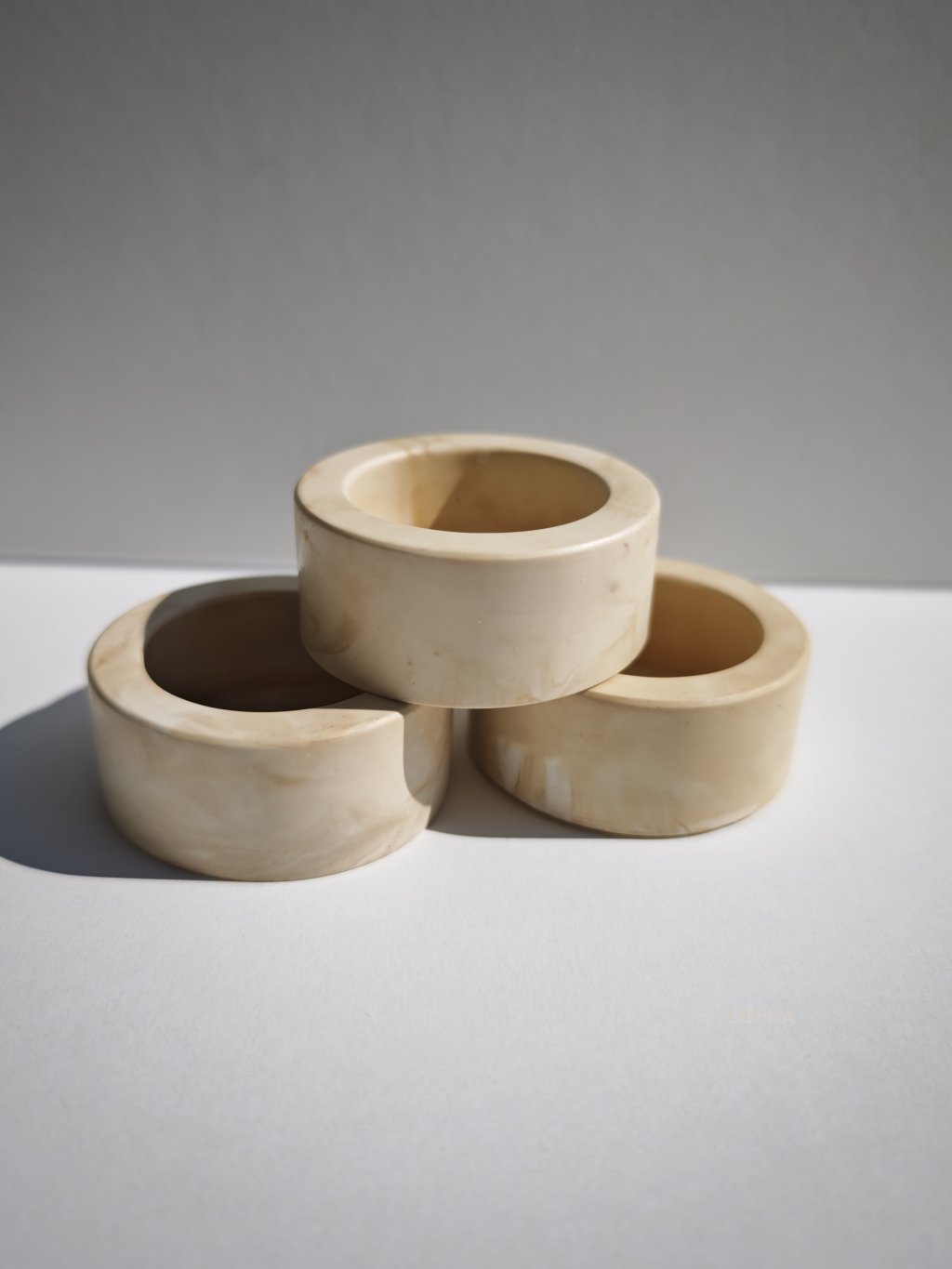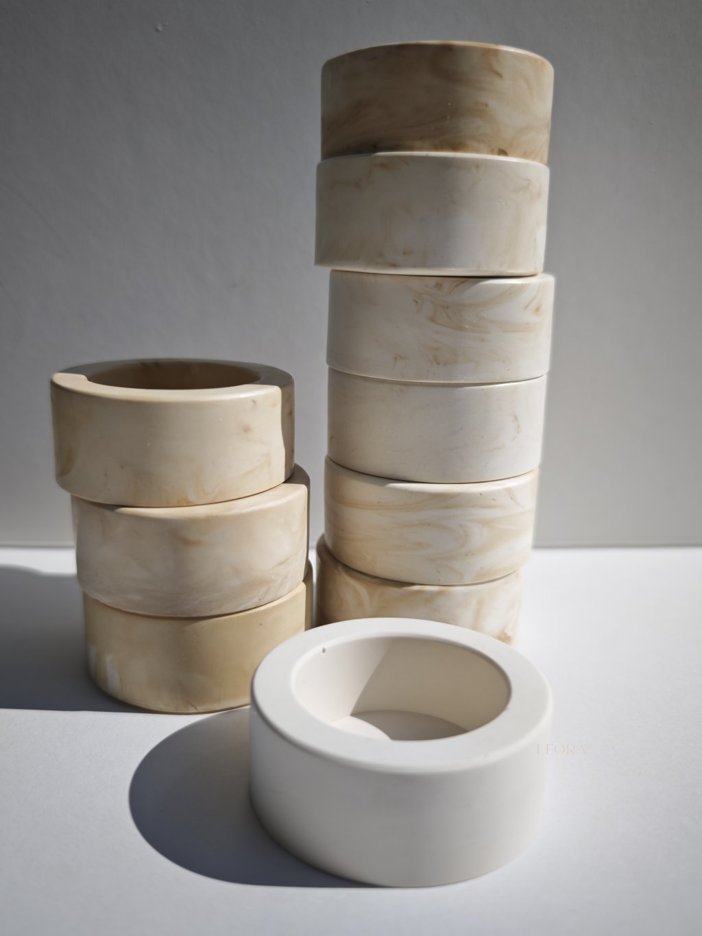 Vyrobené z ekologickej hmoty Jesmonite. Jesmonite je špičkový kompozitný materiál bez obsahu rozpúšťadiel, je kombináciou prírodných surovín so špeciálnou zmesou čistých akrylových polymérov na báze vody. Je to ekologická a bezpečná alternatíva k živici, betónu alebo sadre.