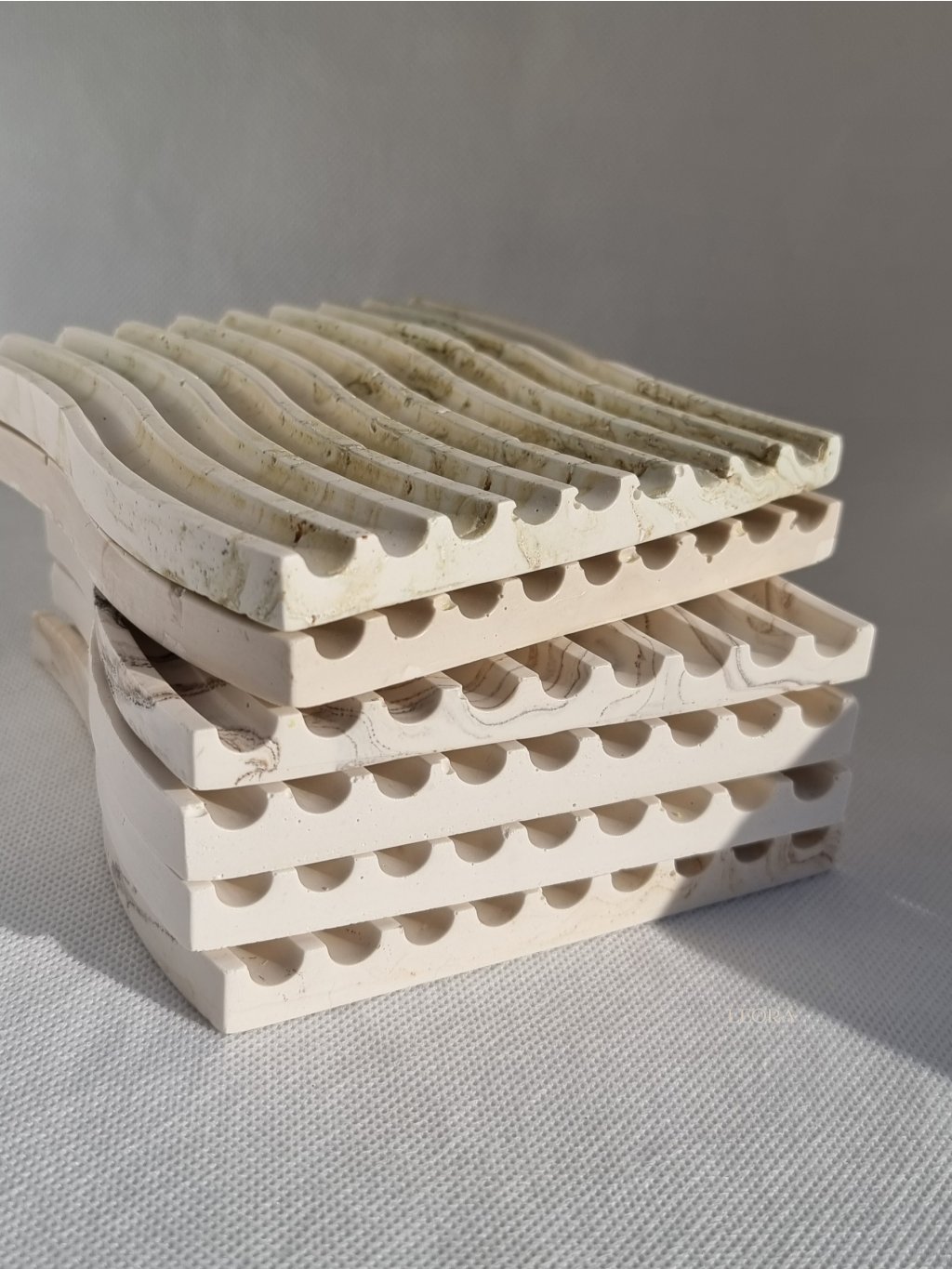 Vyrobené z ekologickej hmoty Jesmonite. Jesmonite je špičkový kompozitný materiál bez obsahu rozpúšťadiel, je kombináciou prírodných surovín so špeciálnou zmesou čistých akrylových polymérov na báze vody. Je to ekologická a bezpečná alternatíva k živici, betónu alebo sadre.